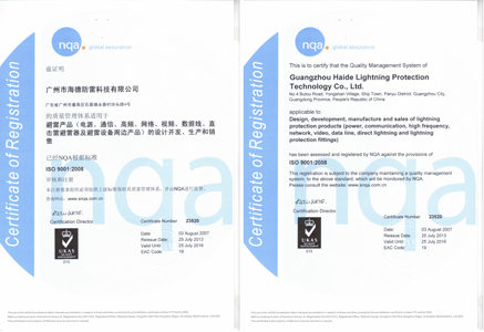 廣州市海德防雷科技有限公司已經(jīng)通過“ISO9001質(zhì)量管理體系認(rèn)證”,海德公司堅持在該體系的嚴(yán)密監(jiān)控下嚴(yán)格挑選供應(yīng)商,嚴(yán)控生產(chǎn),確保質(zhì)量的可靠性和穩(wěn)定性。同時公司產(chǎn)品已通過“北京雷電防護(hù)裝置測試中心”、“信息產(chǎn)業(yè)部通信產(chǎn)品防護(hù)性能質(zhì)量監(jiān)督檢驗中心”和“中國賽寶實驗室”等國家級權(quán)威檢測機(jī)構(gòu)的嚴(yán)格檢測,并經(jīng)各地防雷中心備案,為廣東省防雷中心推薦使用雷電防護(hù)產(chǎn)品。