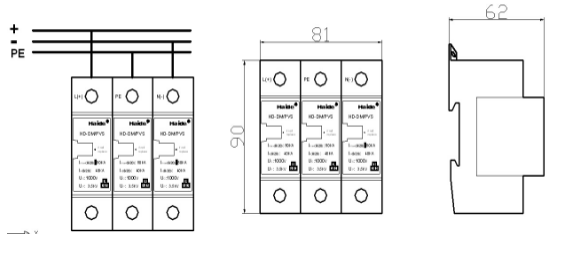 DIN導(dǎo)軌安裝,適用于600~1000V直流電源系統(tǒng)的防雷及過電壓保護(hù)。主要用于太陽能光伏發(fā)電系統(tǒng)等的電涌保護(hù),并聯(lián)安裝,不影響原系統(tǒng)的正常工作。