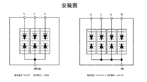 電源相線(L)、零線(N)分別接入電涌保護器相應接線端子,保證牢固及可靠,將避雷器接地端與防雷地線(推薦接地電阻≤4Ω)作良好電氣連接。