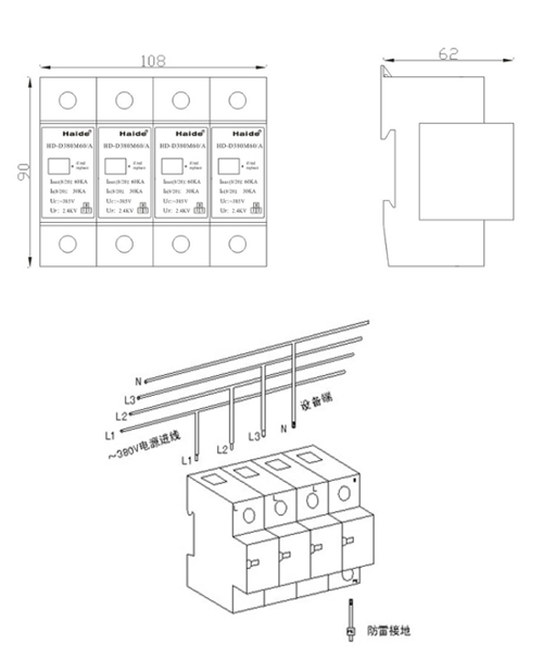 電源相線(xiàn)(L)、零線(xiàn)(N)分別接入電涌保護(hù)器相應(yīng)接線(xiàn)端子,保證牢固及可靠,將避雷器接地端與防雷地線(xiàn)(推薦接地電阻≤4Ω)作良好電氣連接。