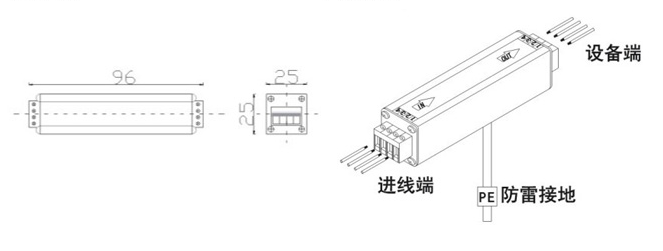 在被保護(hù)設(shè)備的線路接口前段串聯(lián)接入避雷器,“OUT”為設(shè)備端、“IN”為進(jìn)線端,將避雷器接地端與防雷地線(推薦接地電阻≤4Ω)作良好的電氣連接。