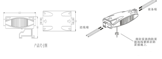 在被保護設(shè)備的線路接口前段串聯(lián)接入避雷器,“OUT”為設(shè)備端、“IN”為進線端,將避雷器接地端與防雷地線(推薦接地電阻≤4Ω)作良好的電氣連接。
