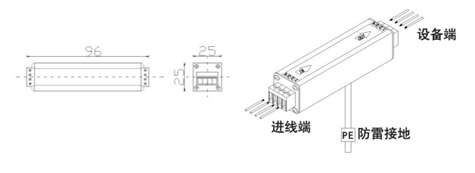 在被保護(hù)設(shè)備的線路接口前段串聯(lián)接入避雷器,“OUT”為設(shè)備端、“IN”為進(jìn)線端,將避雷器接地端與防雷地線(推薦接地電阻≤4Ω)作良好的電氣連接。