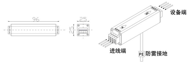 在被保護設(shè)備的線路接口前端串聯(lián)接入避雷器,“OUT”為設(shè)備端、“IN”為進線端,將避雷器接地端與防雷地線(推薦接地電阻≤4Ω)作良好的電氣連接。