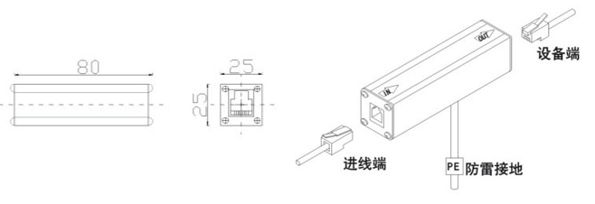 在被保護(hù)設(shè)備的線路接口前段串聯(lián)接入避雷器,“OUT”為設(shè)備端、“IN”為進(jìn)線端,將避雷器接地端與防雷地線(推薦接地電阻≤4Ω)作良好的電氣連接。