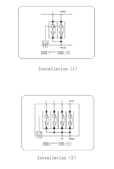 Plug the power phase line (L) and null line (N)into corresponding connector of the electric surge protector and make sure it's firm and reliable. Connect the ground terminal of arrester with the ground lead of lightning protection well (recommended earth resistance ≤4Ω).